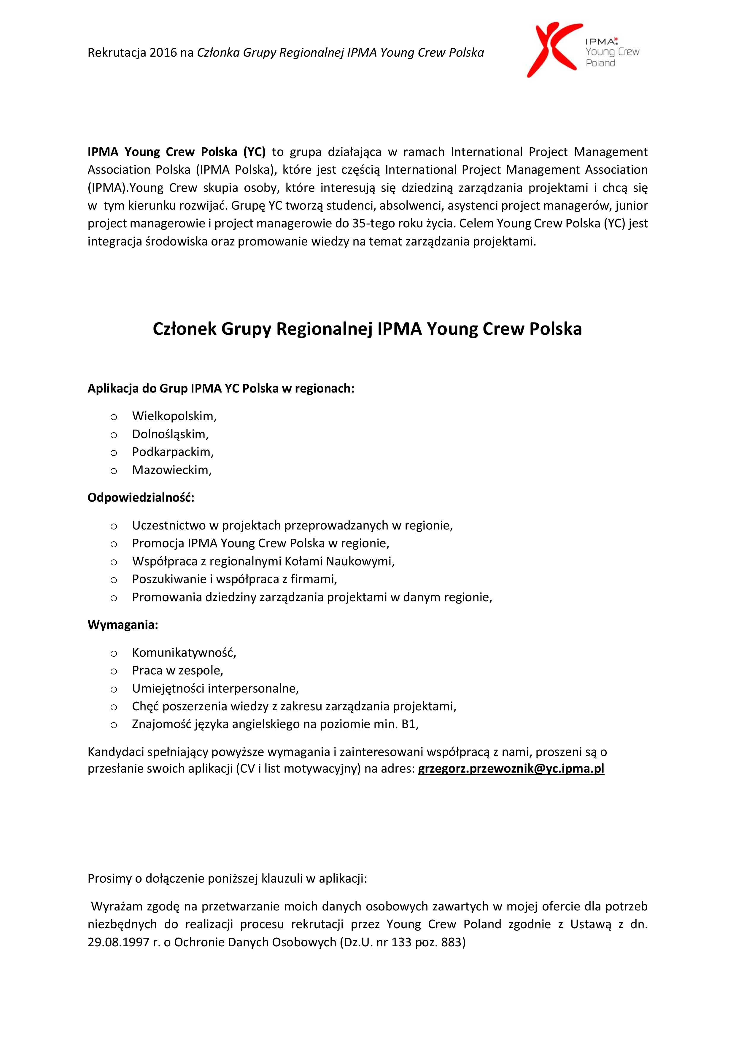 Jeśli jesteś zainteresowany dołączeniem do międzynarodowej społeczności Young Crew a może ambicje i zapał do poprowadzenia nowej grupy Young Crew w swoim regionie, zgłoś się do członka rady IPMA Young Crew Polska ds. Koordynatorów i Członkostwa.